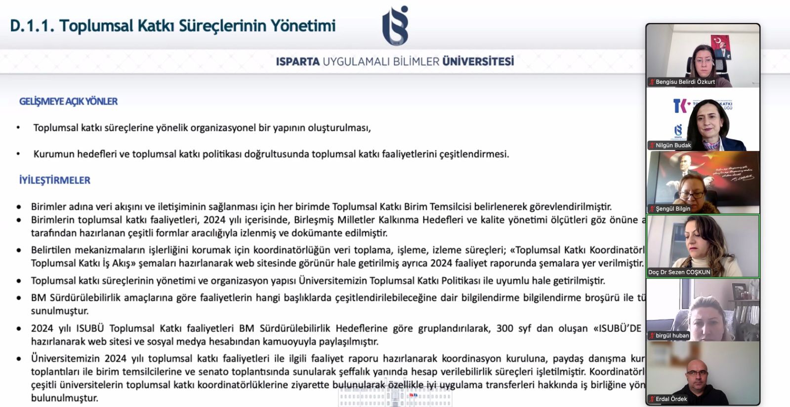 Isparta Uygulamalı Bilimler Üniversitesi Toplumsal Katkı Koordinatörlüğü Birim Temsilcileri toplantısı, ISUBÜ Rektör Yardımcısı Prof. Dr. Murat ÖZTÜRK ve Toplumsal Katkı Birim Temsilcilerinin katılımıyla 19.12.2025 tarihinde yapılmıştır.